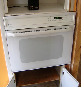 This is the new oven, all installed. You can see that I had to cut away some of the frame to get it in there. Also I had to do some work under it. The old oven was resting on two 2x4's, on a thin piece of plywood, which was unsupported at one corner! Ten inches below this was a shelf made of a thicker piece of plywood. I removed the 2x4's to create enough vertical room for the larger oven, switched the two pieces of plywood so the stronger one supported the oven, did some sawing to make both shelves fit, and nailed in some scrap wood to support them better.
