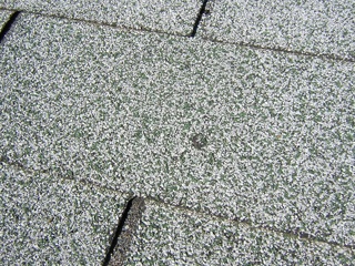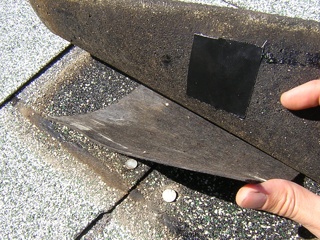 Then I went back on the roof and found a dimple on one of the shingles. Underneath I found this. Apparently one of the nails worked itself loose and fell out, and on the way it made a tiny hole in the shingle above it, conveniently matching the hole below.