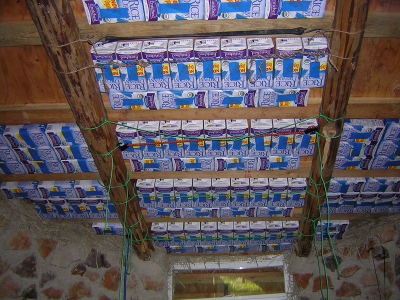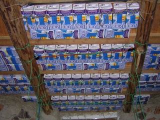 And here you see the project mostly done. The holes are covered with blue painters tape, and we also used that to cover the holes on the ends of the carton where the rice milk came out. At this point we ran out of cartons, and I still have a few more to drink. Those strings between the beams were added by Troy to hold the next layer of insulation, which hasn't been decided yet. If I can't find a cheap source of raw sheep wool, I might use thrift store blankets.