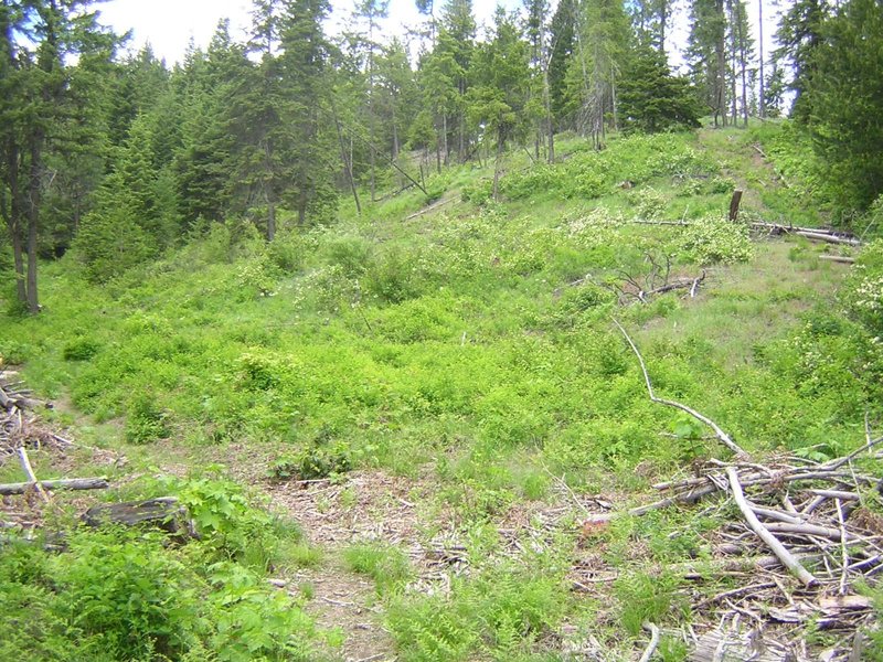 Come work and play in beautiful (in June) wilderness (logged for probably the third time in 2002). The land is nestled on the floor of a rugged canyon (climb for cell phone reception), features hundreds of trees (almost all less than ten inches in diameter), acres of wild strawberries and thimbleberies (total annual fruit production one pound) and oregon grapes (sour as lemons). Improvements include a year-round drinkable spring (drinkable also by mosquito larvae), a sheltered composting toilet (a toilet seat on a bucket in a box in a crude shed), and a rustic camp kitchen (stick-burning stove on a stump). Camp anywhere (in a tent you bring yourself, after you clear the sticks away). Wildlife include deer, moose, turkeys, chipmunks (will chew bags open for nuts and chocolate), an occasional black bear (they hardly ever eat people) and mountain lions (which you will never see, but they can see you).
