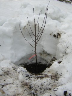 Dealing with the bear damage probably took two hours, and then I still had to plant the trees: one Arctic Jay nectarine, one Tomcot apricot, two Autumn Brilliance serviceberry hybrids, and a goumi. But the holes I dug last fall to plant them in were still hidden under three feet of snow! For the nectarine, I just dug a new hole in a snow-free location where my Veteran peach died two years ago -- hopefully it wasn't the location that killed it! But for the apricot I had to find the hole.