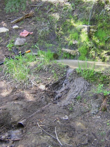 This photo shows how much water comes out in siphon mode, and you can click here for a big photo that shows the water flowing into the lower pool. Last year when I did this, a lot of water overflowed the lower pool and ran down the trail. I'd like to get the overflow into a third pool, and I thought about turning the trail into a stream and building a bridge over it, but that's a huge job, and I decided instead to build some kind of tiny streambed that would take the water over the trail at the top. And when I saw how slow the pipe was running, I decided to do it on this trip.