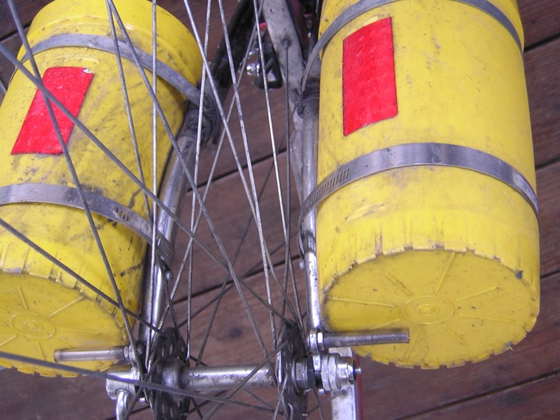 May 3. Tom sends a link about how to make bike panniers from four gallon plastic buckets. Also, here's a photo of my own tupperware pitcher front bike rack. The metal bands are those thingies, I don't know what they're called but you see them around stuff on basement ceilings and you can get them at hardware stores. The bottom bands are held on merely by their own tension and the nubs on the front fork -- which not all front forks have. The upper bands are held on with thick glue, wrapped by tape, wrapped by wires. Those bolts on the bottom (covered with plastic tubing) are also necessary to support the weight. I chose tupperware pitchers because they're the perfect size to hold two-liter water bottles, and I wanted to put water up front to equalize the weight on long trips. But if you do that, you need some padding on the bottom or else tiny rocks will get in there and puncture your bottles. The photo is from below and behind the pitchers. It looks weird because it was taken with the bike upside down and then flipped.