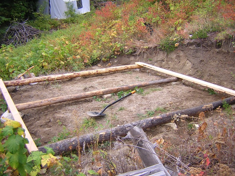 The Tent Platform -- 19 September 09 -- A few years ago Chris helped me dig a spot near the bottom of the north hill, where I was planning to build a cabin. Then this year I got a really nice canvas wall tent from davistent.com, and put it there temporarily. Then I decided that the spot was too dark in the winter, too small, and too unstable for the cabin, and that I'd keep the tent there permanently. Since then, almost every visitor has told me I should put it on a platform. It will help keep it dry, and apparently some people would rather sleep on a wooden floor than on the ground.
