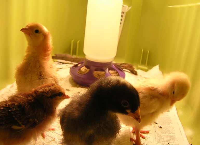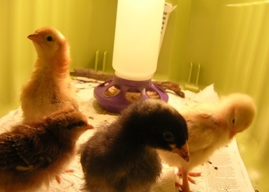 Right now they're all under heat lamps. In a few weeks they'll go out in the back yard in an Omlet Eglu Classic coop. I'm showing my sister how to make sprouted wheat, which is much better for them than unsprouted. She says the best book is City Chicks, and Raising Chickens for Dummies is also very good.