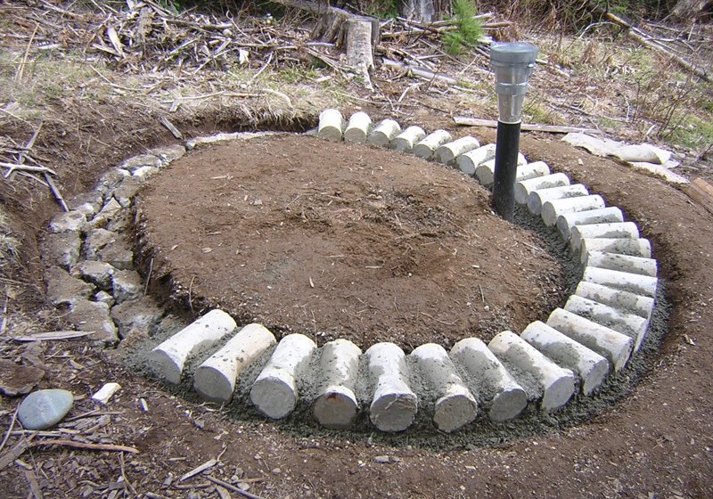 And here's what went on top: the concrete test cylinders that I picked up last August. This was how far eight bags got us. Yes, I rinsed the dirt off before putting the concrete on. Also, I covered all this up with wet leaves to keep it moist so it could cure better. And I'm going to have to throw in lava rock and dig a trench to carry off water that would otherwise fill the foundation and freeze next winter. To find out how much the frost under the foundation will damage the structure, is one of the things this structure was designed for.