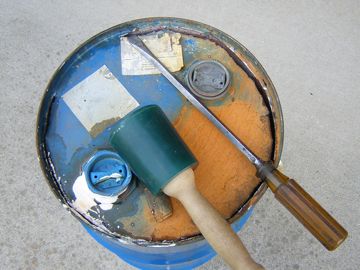 I wasn't sure how I was going to open the sealed ones. My first idea was to ask my brother-in-law to bring his Sawzall when he visits in August, and I even bought a $3 blade for it. But that would require me to keep ugly barrels around the housesit, and also to haul the first one back from the land, which doesn't have electricity. So I wondered how hard it would be to just spend a couple hours sawing around the edge of the lid with the blade in my hand. First I would have to make a gap to get the blade in, so I got the biggest screwdriver I could find and pounded it through with a mallet.