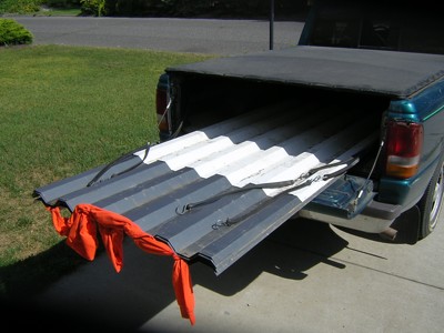 Roofing -- 20 July 09 -- This is seven sheets of roofing, 40 inches by 10 feet, plus an extra that's 40 inches by 8 feet. I just bought it from a guy on Craigslist who called it "9+ sheets HEAVY gauge corrugated metal roofing 4'x10' no holes $18ea". I was really looking for something like this, and apparently I'm not alone, because here's a site selling new rusty metal roofing for $140-200 per 100 square feet.