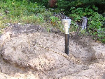 Underground House Complete -- 30 August 09 -- I'm joking. This is the intake for a greywater sump. Chuck came up from Portland this weekend and donated and mostly installed it. That elliptical shape around it, I'll explain another time.