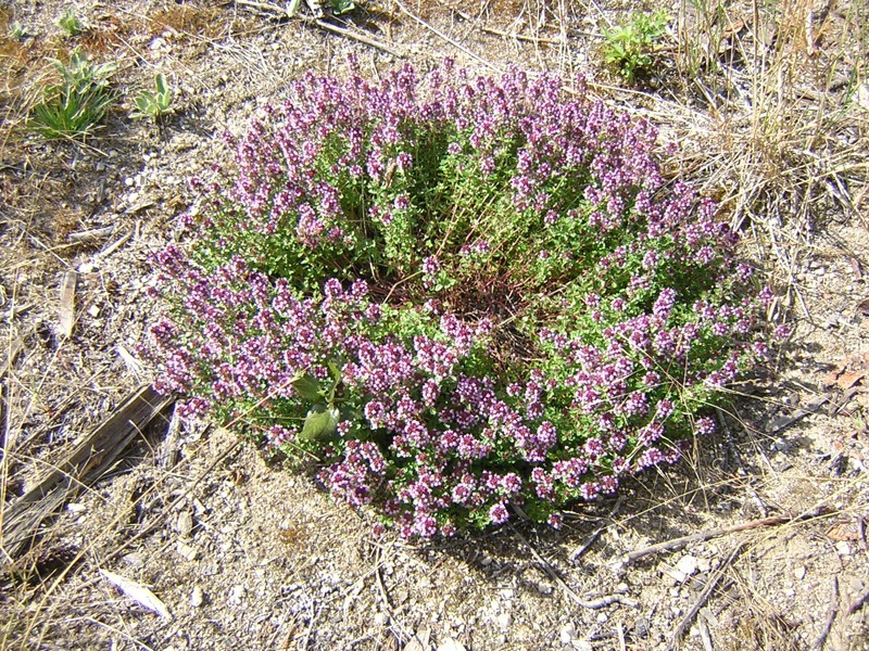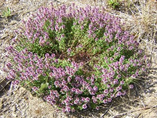 Wild Thyme? -- 22 August 09 -- I noticed this tiny bush growing in one of the more desolate parts of the "parking lot" area, but didn't try to identify it until it burst out with pink flowers that attracted even more insects than the knapweed. I still don't know the latin name, but it tastes like oregano. [Update: I decided it has to be thyme, because thyme is taprooted and oregano is not, and only something with a very deep root could thrive in this location.]