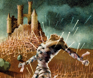 Mycelia Swell Like the Sea is a mid-complexity fungal spirit that's good at corralling invaders and removing blight. All of its powers are things that fungus can really do. Its main power, Ergot Dance Plague, gathers invaders to compulsively dance instead of building and ravaging. It can grow psychedelic mushrooms in the path of explorers, who give up on colonization or even go native. And its scary power is something I thought was fictional when I made the card, but it's real, a "fungal storm" where a great wind carries spores that make people sick. Three of the card images are by my favorite artist, the Spanish painter Remedios Varo.
